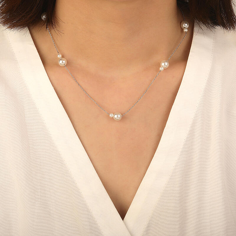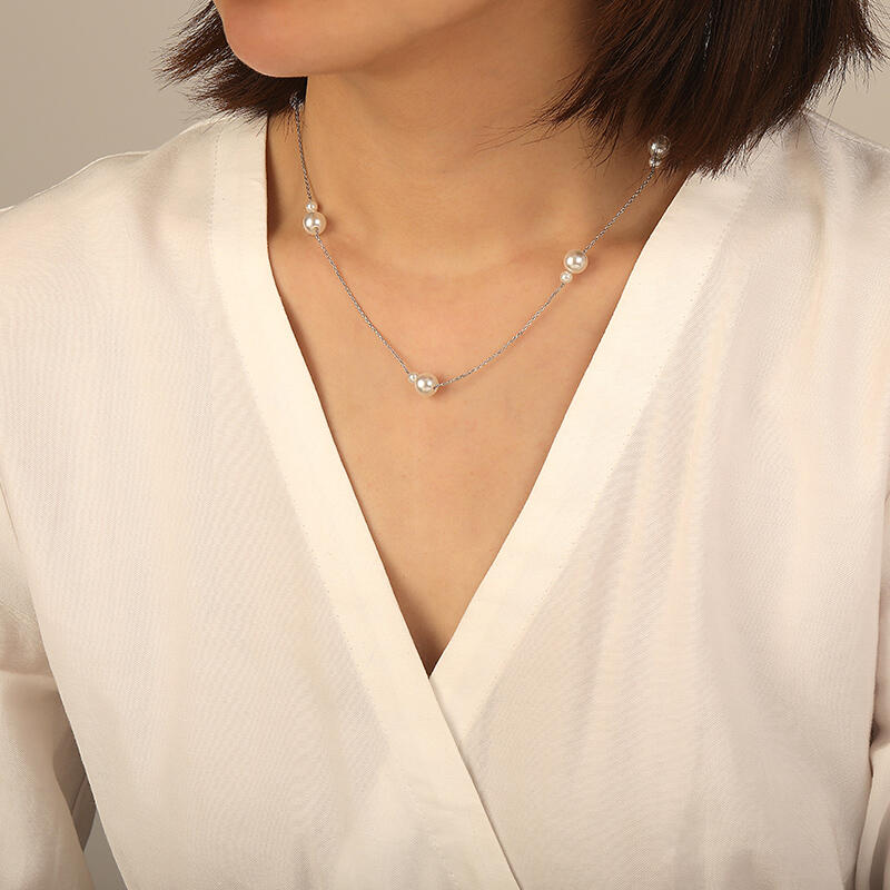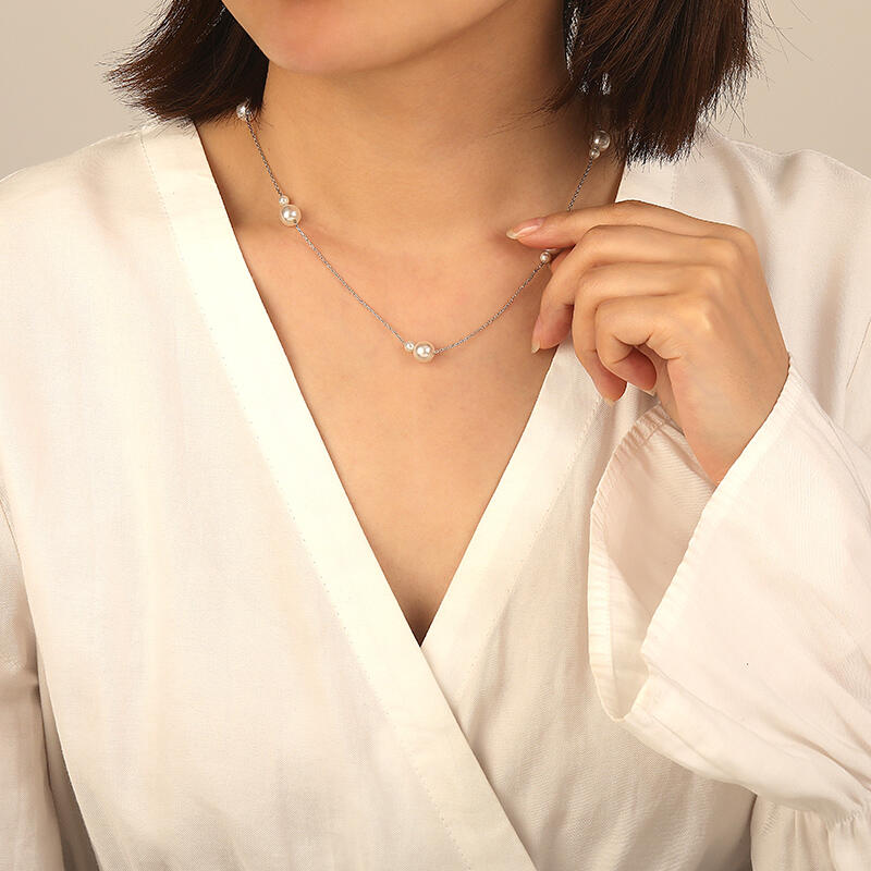 大小の真珠を組み合わせた5つのグループが特徴のネックレス。控えめなデザインながら、洗練された大人の女性らしさを演出。シンプルな装いを格上げする定番アイテム。