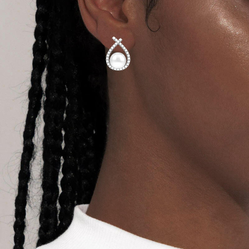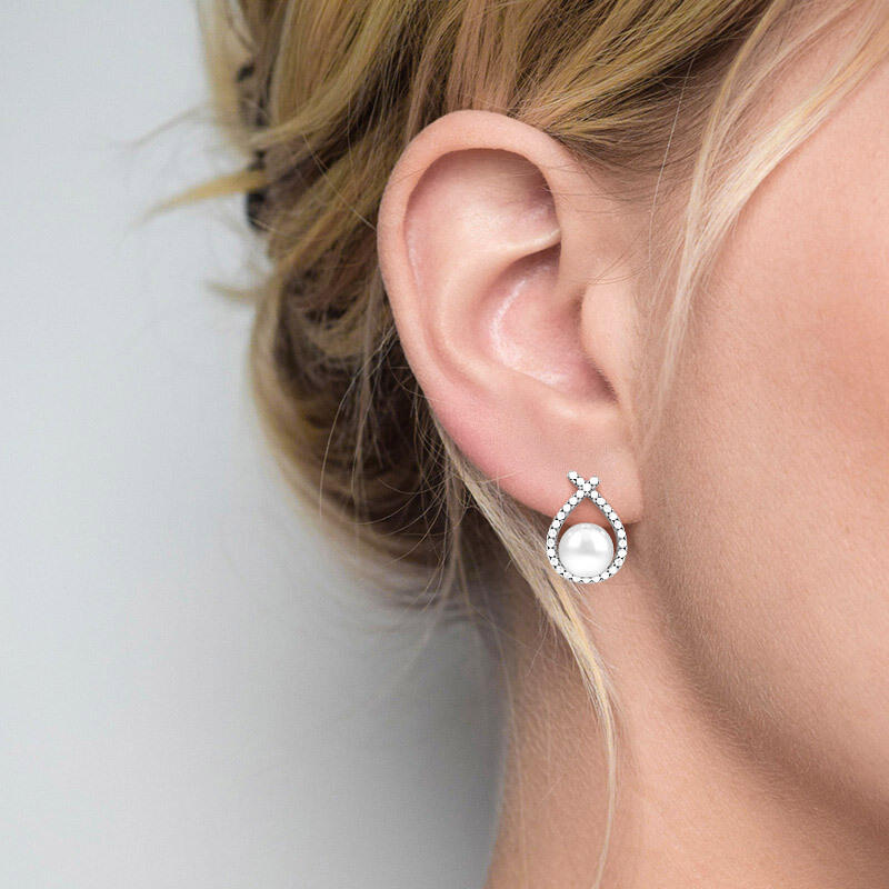 耳元を彩るエレガントなスタッドイヤリング。涙型のフレームにきらめくジェムストーンを配し、中央には光沢ある真珠が輝きます。洗練されたデザインが、どんな装いにも上質なアクセントをプラス。シンプルながら存在感ある逸品です。
