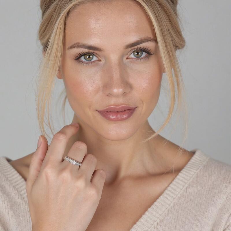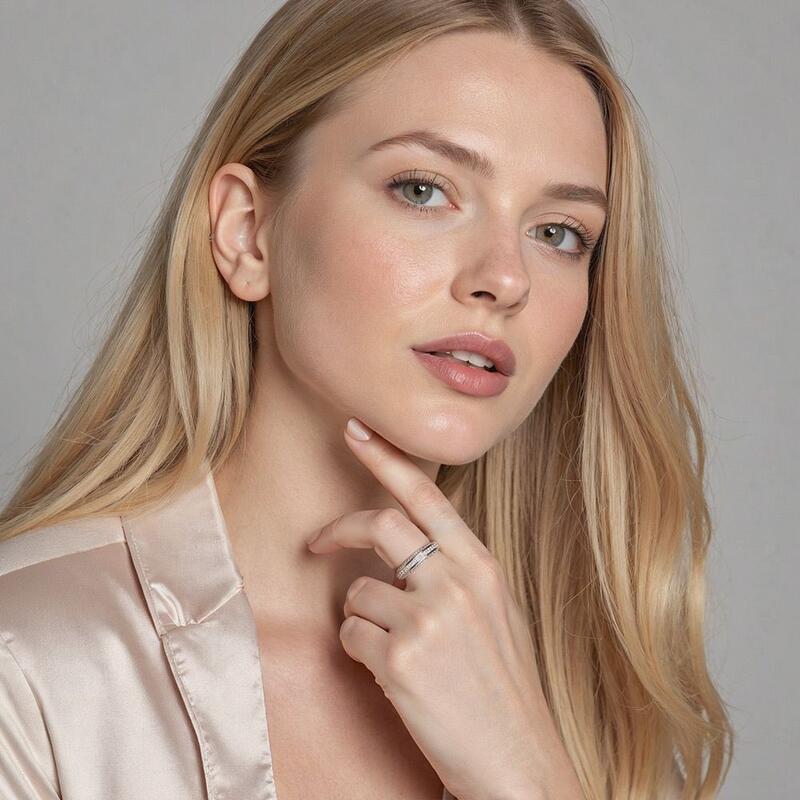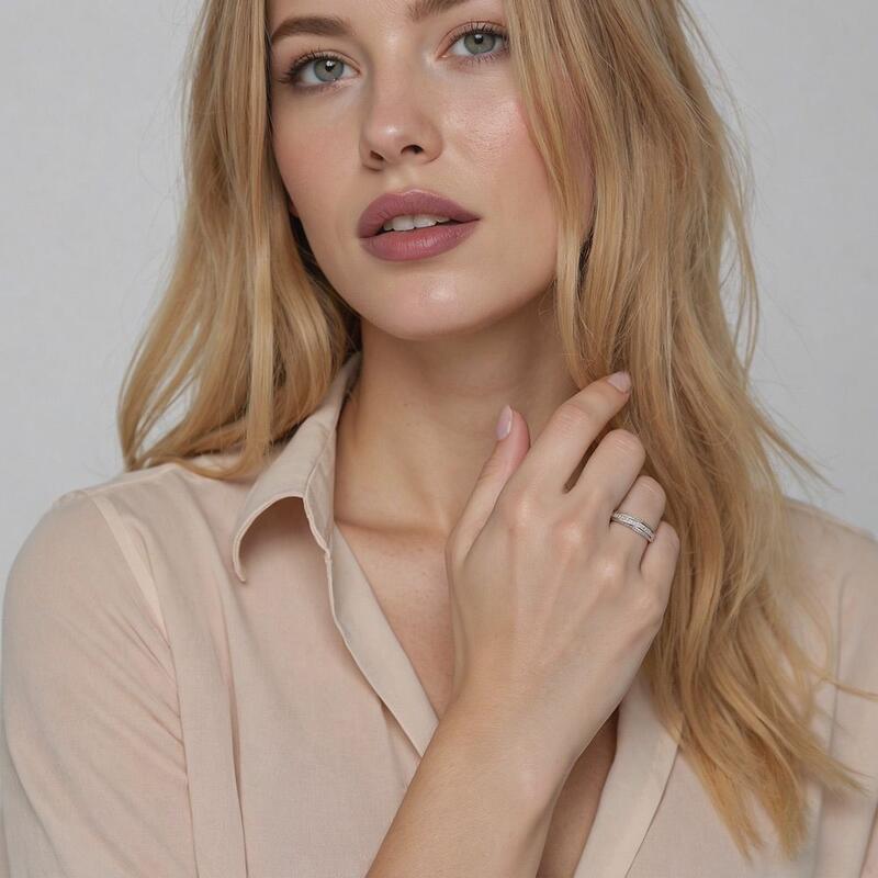 セミエタニティバンドの新たな美学。プリンセスカットストーンが織りなす洗練されたチャンネルセッティングは、モダンな煌めきを放つ。ミニマルでありながら存在感溢れるこの指輪は、永遠の愛を誓う最上の証となる。