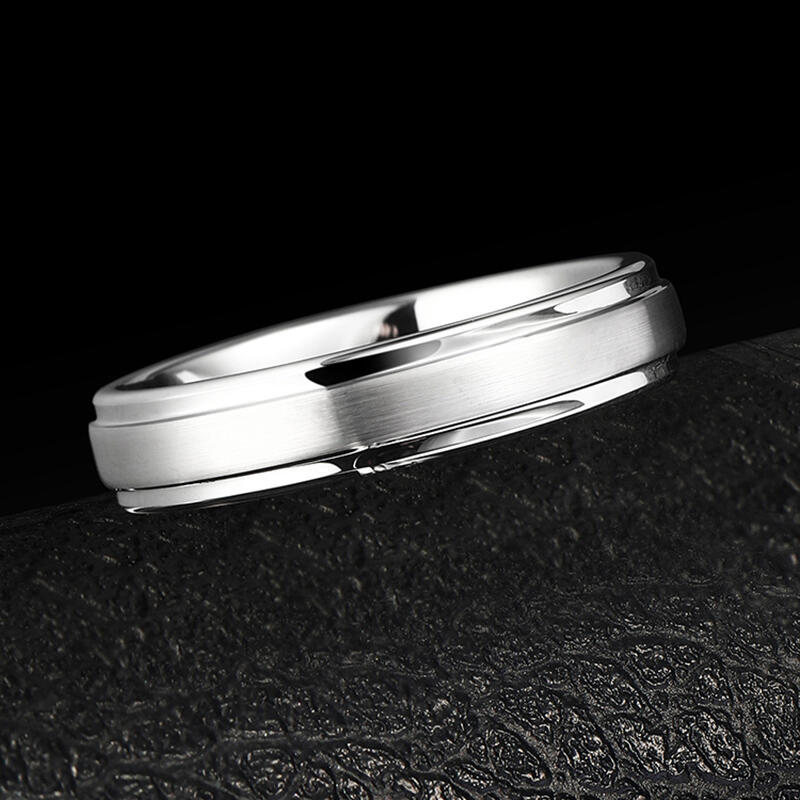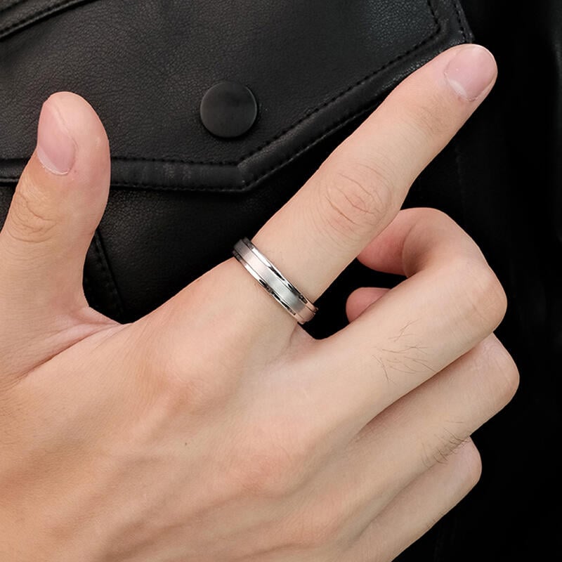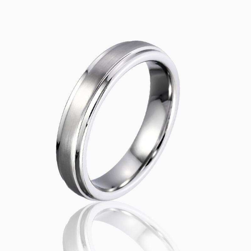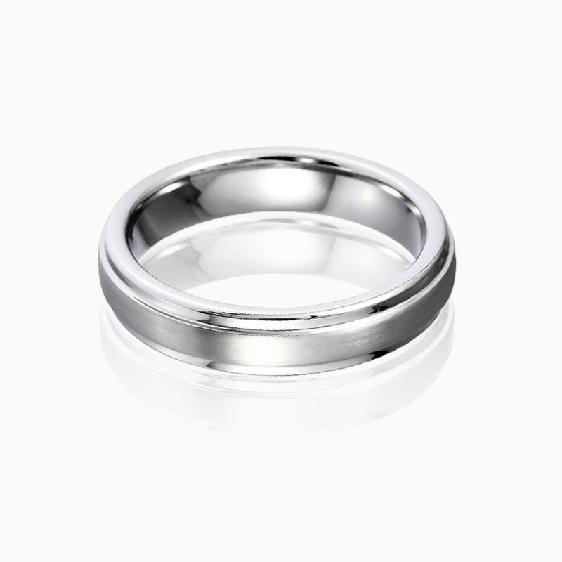 この男性用ウェディングバンドは、滑らかなブラッシュド仕上げで控えめな洗練さを放ち、光を繊細に捉える上品なマットテクスチャーを提供します。ステップエッジのディテールが印象的な建築的要素を加え、モダンでありながら永遠のスタイルを叶えるクリーンなラインと立体感を創出しています。