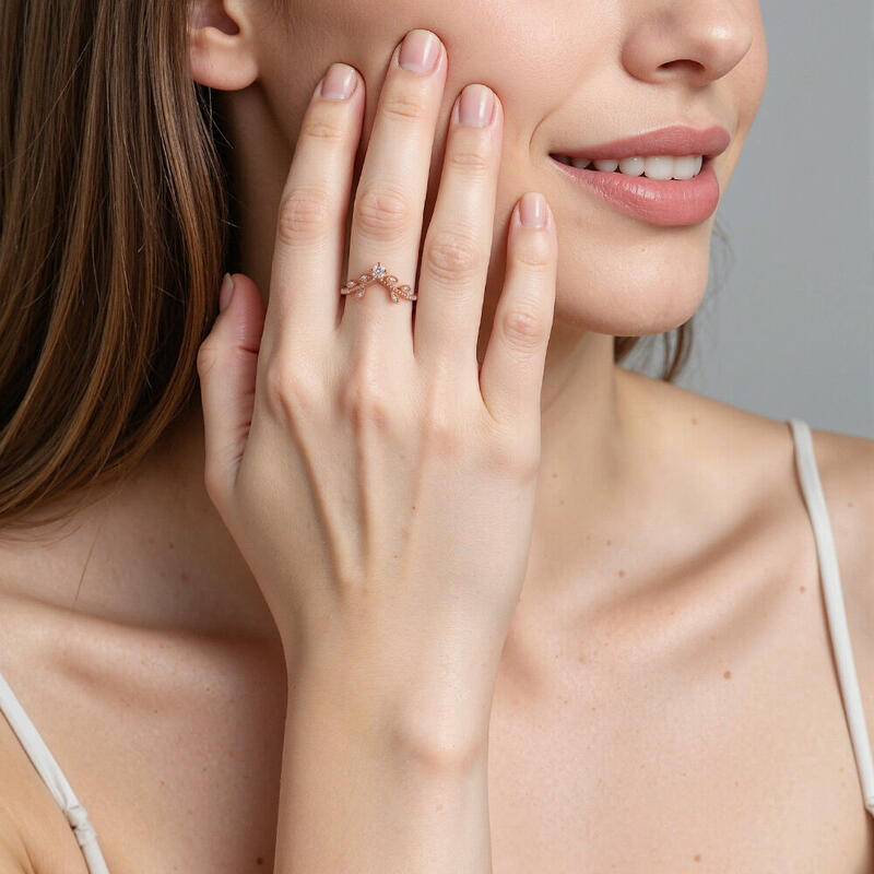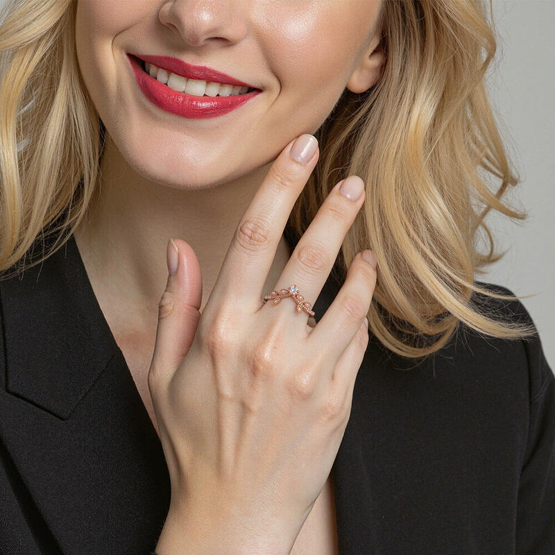 モダンなデザインのバンドは、どんなスタイルにも洗練されたエレガンスを加えます。シャンクに施されたリーフモチーフが人生の自然な喜びを思い起こさせます。ラウンドカットストーンのきらめきと精巧なミルグレインボーダーが輝きを演出。重ね付けでも単品でも、この傑作が存在感を放ちます。
