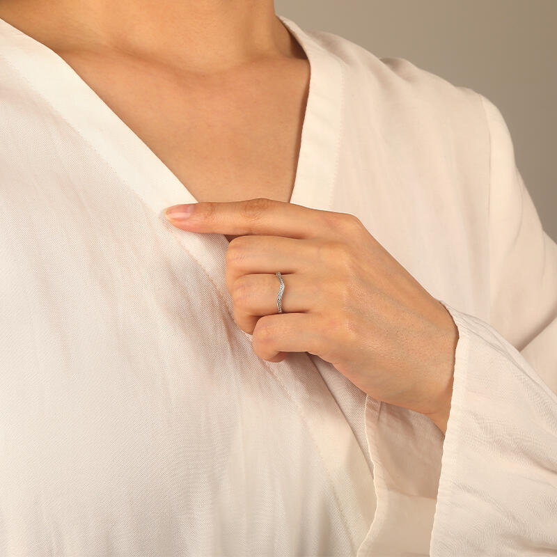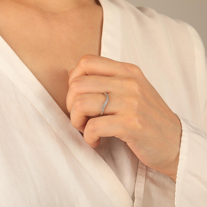 クラシックなウェディングバンドをモダンに進化させたデザイン。シンプルながらも洗練されたグラデーションストーンが、エンゲージリングと重ね付けした際に優雅な輝きを演出。単独着用でも日常的な控えめな魅力を放ちます。