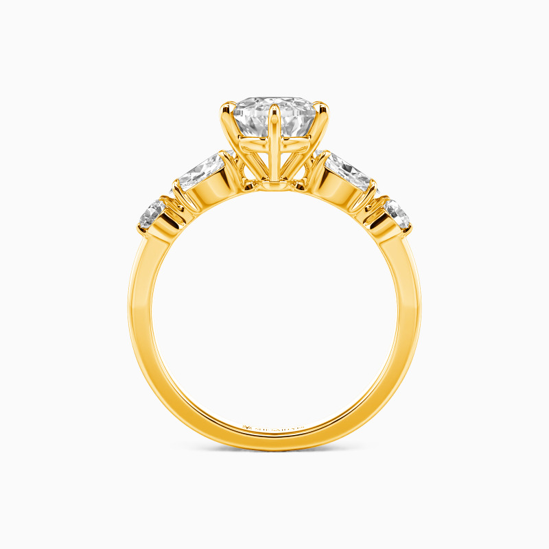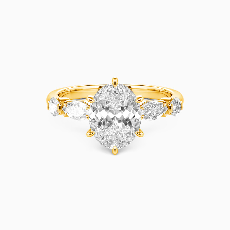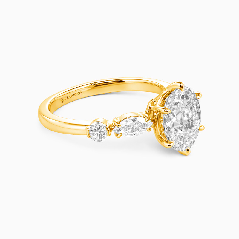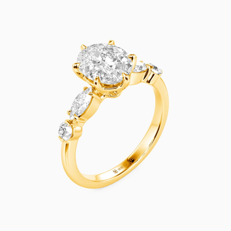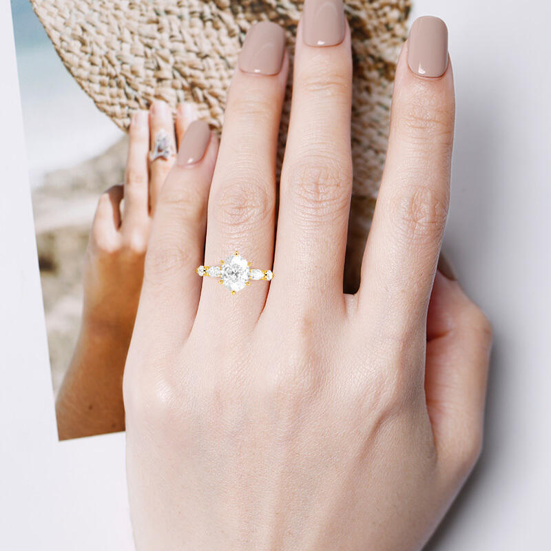 このエレガントなサイドストーン付き婚約指輪は、中央に輝くオーバルカットのダイヤモンドをあしらい、周りにはマーキスカットとラウンドカットのサイドストーンが華やかに並んでいます。流れるようなラインのデザインが光を滝のように反射させ、オーバルの柔らかな曲線と輝きを美しく引き立てます。クラシックで永遠の美しさを持ちながら、現代的なスタイルも兼ね備えたリングで、愛の永遠さとモダンな魅力を象徴し、優雅な印象を与えます。